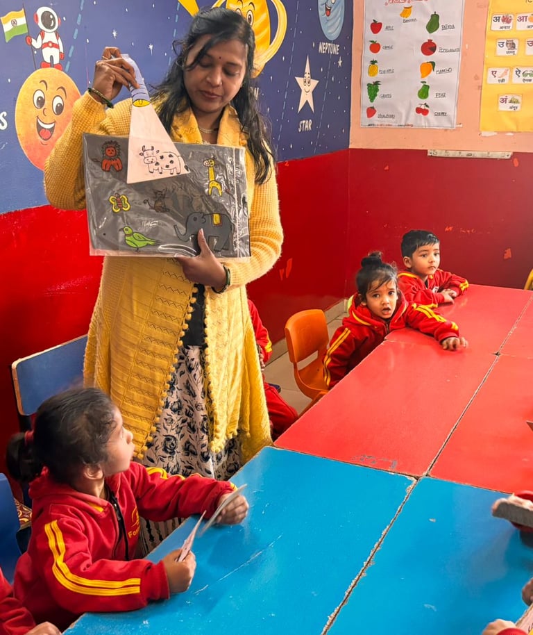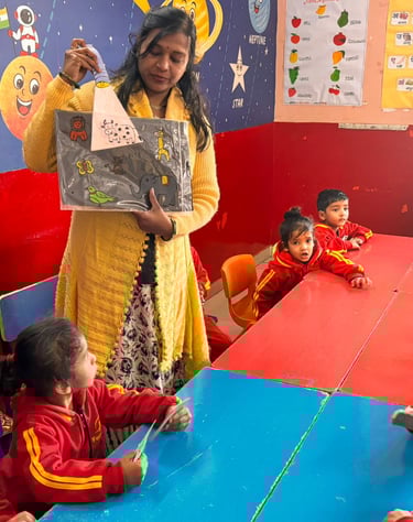 Interactive phonics (alphabet sounds), number recognition (1-50), simple patterns/addition, EVS walks, drawing practice, and group rhymes develop observation, sequencing, and collaboration. Festival activities embed cultural values.